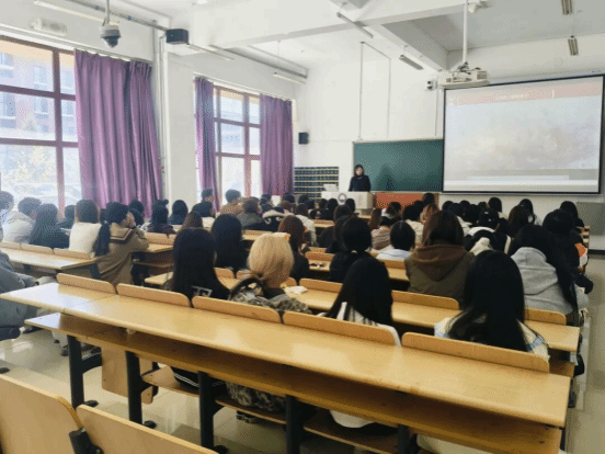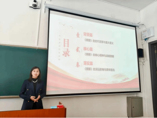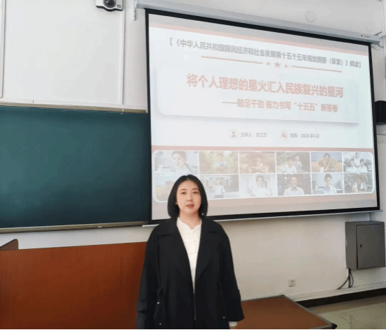 刘立杰老师以“《中华人民共和国国民经济和社会发展第十五个五年规划纲要(草案)》解读”为核心,从背景篇、核心篇、落实篇三个维度展开宣讲。她首先带领同学们认识2026年全国两会的时代坐标,阐明本次会议是开启“十五五”新征程的“出征动员会”,解读了经济增长、创新驱动、民生福祉等关键目标指标,让同学们清晰了解国家未来五年的发展蓝图。随后,她聚焦两会报告中的“关键提法”与“焦点话题”,深入阐释了“投资于物和投资于人”“中国服务”等新思想新观点,解读了初婚初育家庭住房保障、失能老年人养老服务补贴、免费学前教育政策等民生热点,让同学们感受到国家发展“以人民为中心”的鲜明导向。